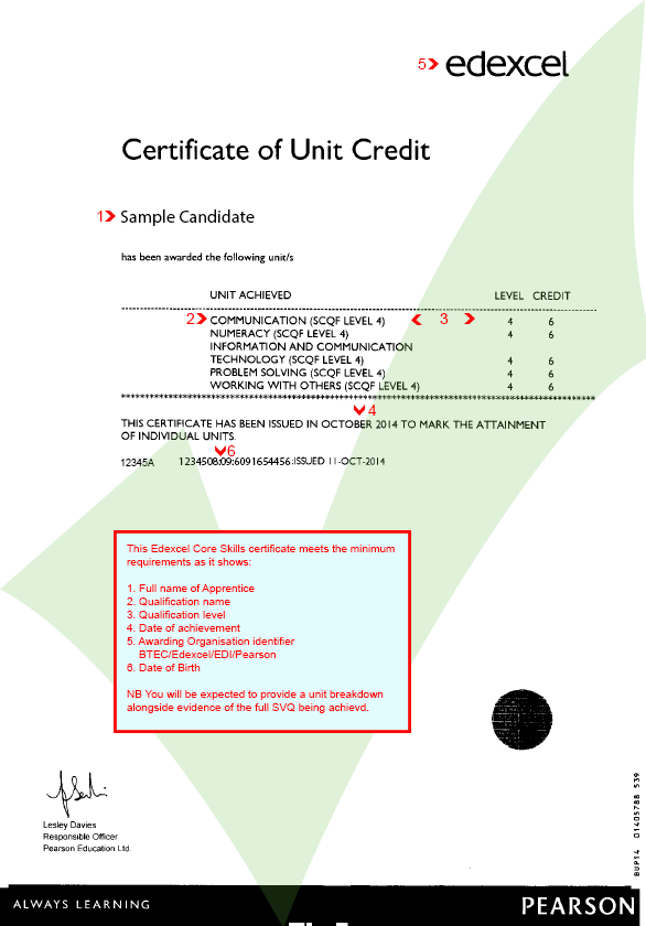 Edexcel unit credit cert showing core skills